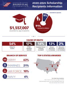 In 2020, we were able to award more than $1.5 million to 359 scholarship recipients across the U.S. 155 were new scholars and 204 were returning scholars. See the image below for more information regarding our 2020 scholarship program. The 2020-21 scholarships bring the total grant money awarded by Folded Flag to more than $7.5 million.